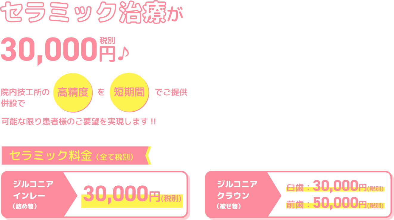 諦めたことがあるより多くの患者様にセラミック治療を受けていただくために、適正価格で治療を提供できるように努力をしています。提携の技工所と密接に連携をとることで、他の歯科医院よりも低い価格帯でのセラミック治療が可能になっています。